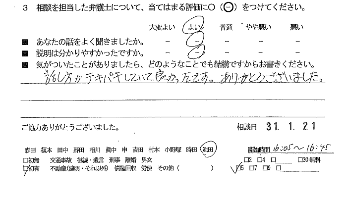 お客様の声(ご相談者の声)口コミ・評判 2019年4月15日 お客様の声 話し方がテキパキしていて良かったです。ありがとうございました。 ■あなたの話をよく聞きましたか:よい ■説明はわかりやすかったですか:よい 「お客様の声(ご相談者の声)口コミ・評判」 「お客様の声(ご相談者の声)口コミ・評判」